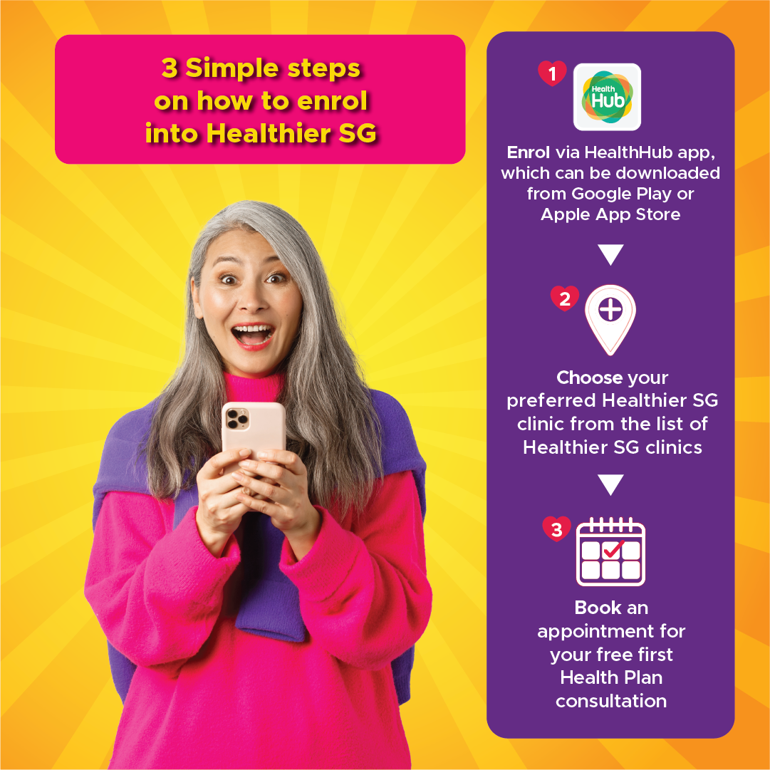 Enrol via the HealthHub app, which can be downloaded from Google Play or Apple App Store.